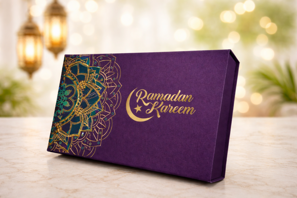 A Ramadan box is a specially designed packaging solution used for presenting gifts, dates, chocolates, and festive items during the holy month of Ramadan. These boxes combine elegance, cultural aesthetics, and premium quality to create a memorable gifting experience. Widely used for corporate gifting, retail packaging, and personal use, Ramadan boxes are crafted using high-quality materials with luxurious finishes. They are available in various styles such as rigid boxes, magnetic closure boxes, and partition boxes. Fully customizable with Islamic patterns, branding, and colors, Ramadan boxes are highly popular across UAE and Saudi Arabia for festive gifting and promotional purposes.